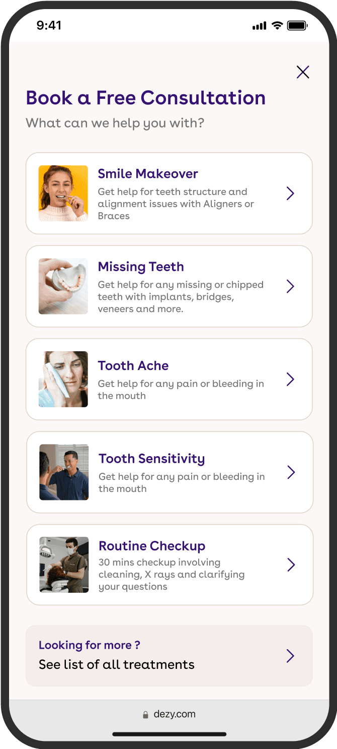 A Treatment Aware User: This includes users who have a good idea of what treatment to book, and can have a good idea of what dental problem they have as well. These users have some clarity and may just need to quickly book a consultation for that treatment.