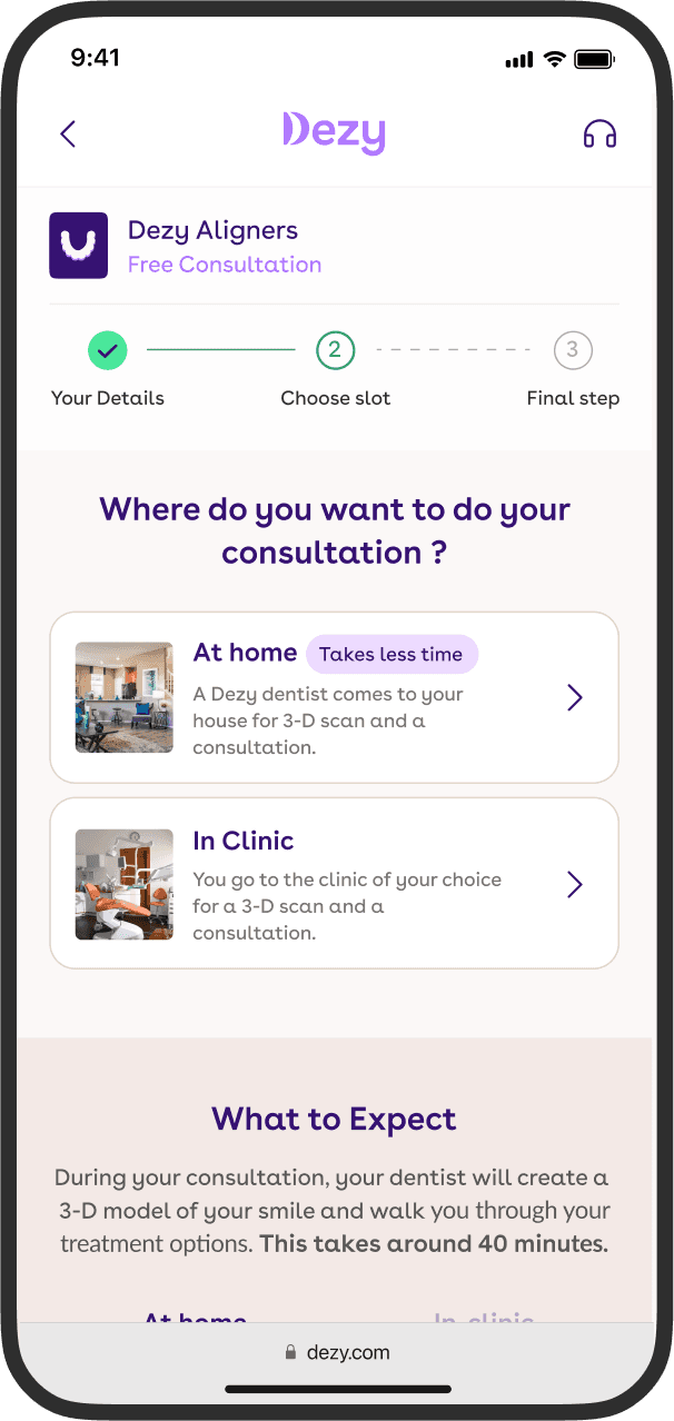 After users added their details, they could select the place of consultation. To better help users decide between the two choices, I added a section called “What to Expect” which would take users through a carousel that shows the steps involved along with a FAQs section. The idea was to appease any anxiety or address possible objections within the flow itself.