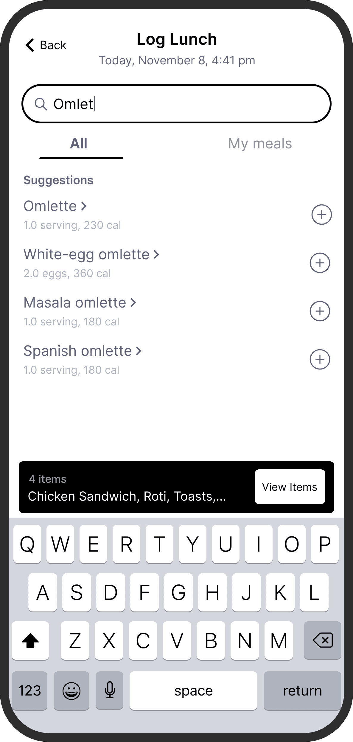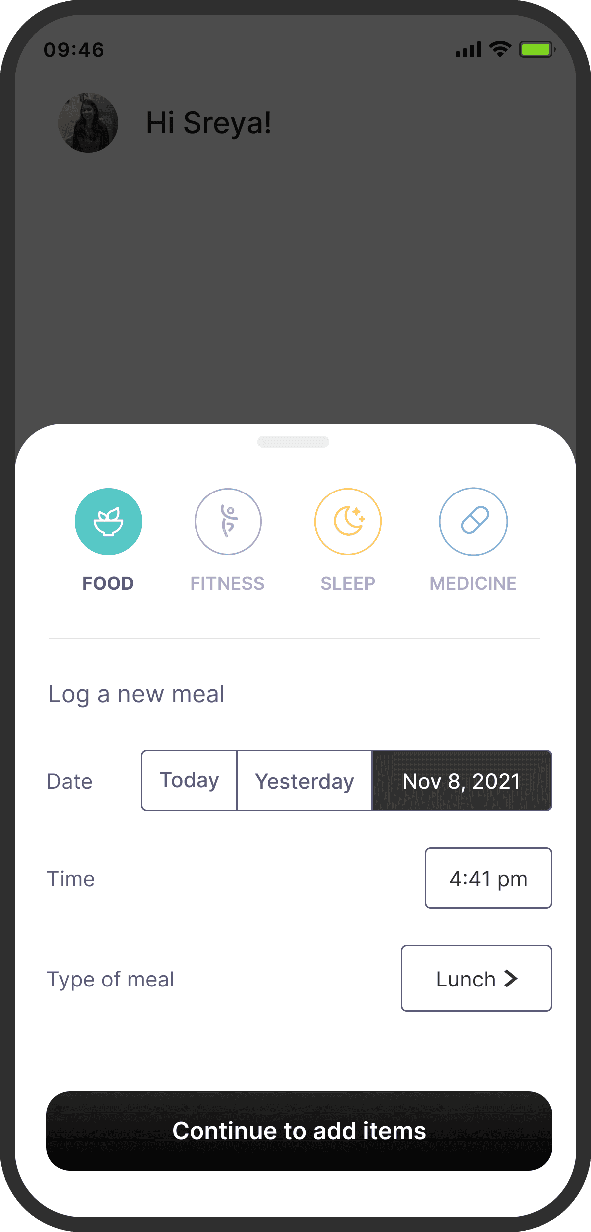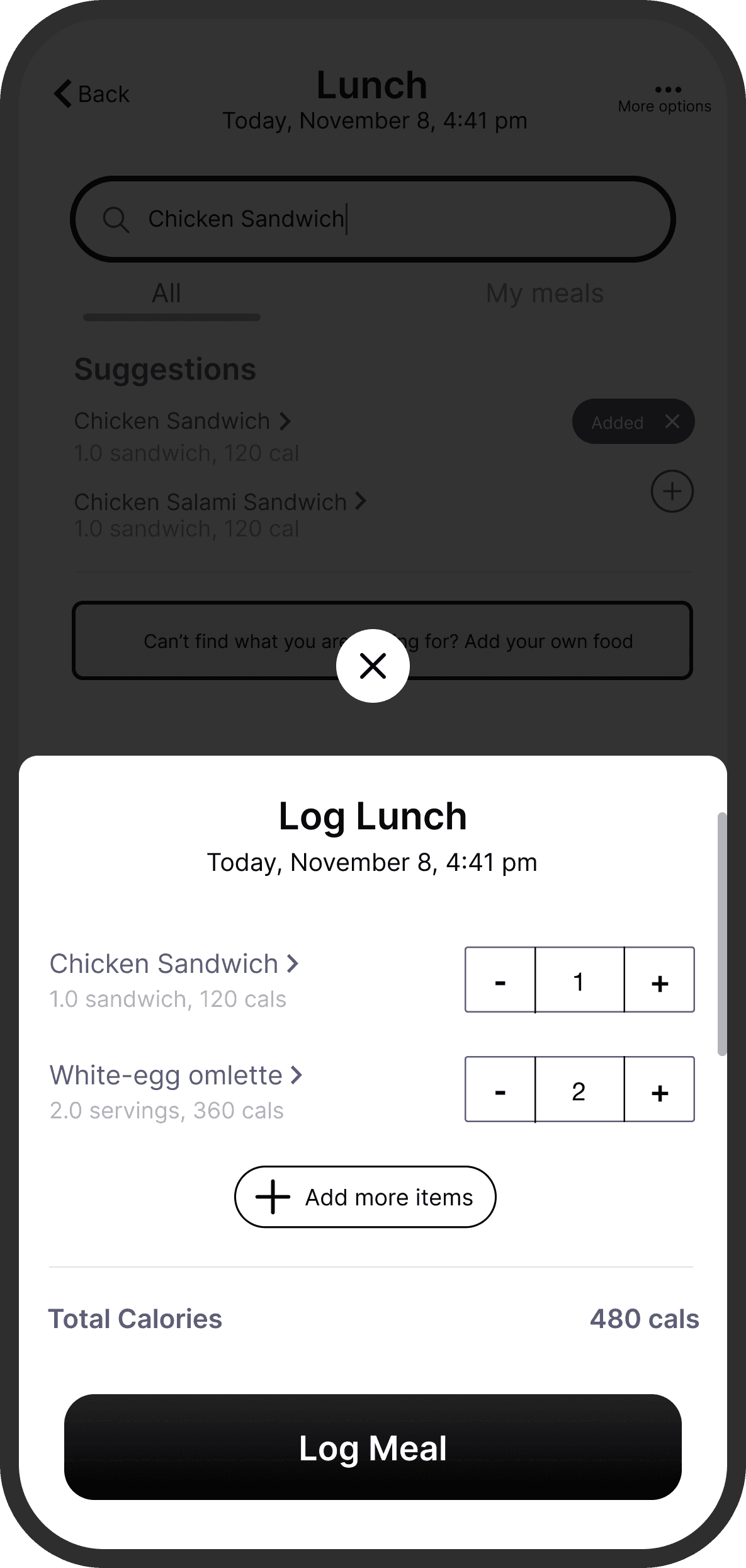 To promote recall and reduce going back and forth, I added a persistent basket that would show items that were logged in the same flow. I got this idea from food delivery apps. To preserve context, I also retained the date and time of logging, which the user would have selected in the previous screen.