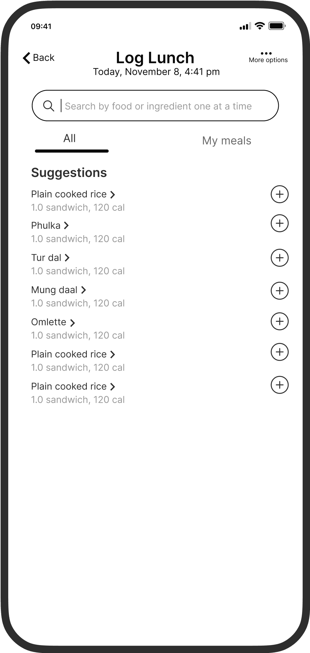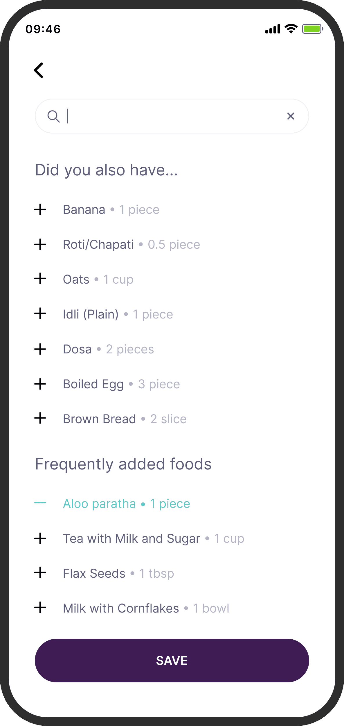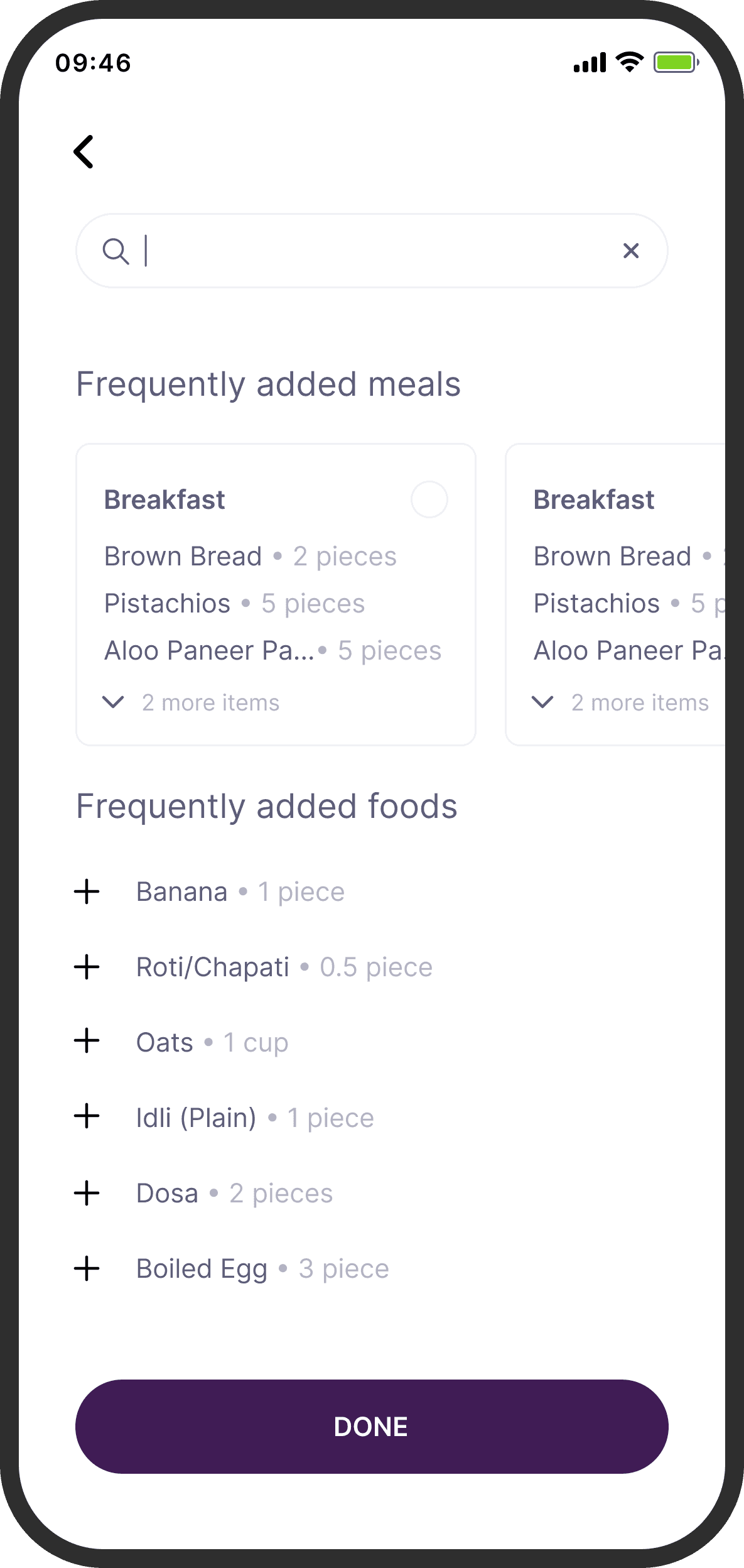 To promote recall and reduce going back and forth, I added a persistent basket that would show items that were logged in the same flow. I got this idea from food delivery apps. To preserve context, I also retained the date and time of logging, which the user would have selected in the previous screen.