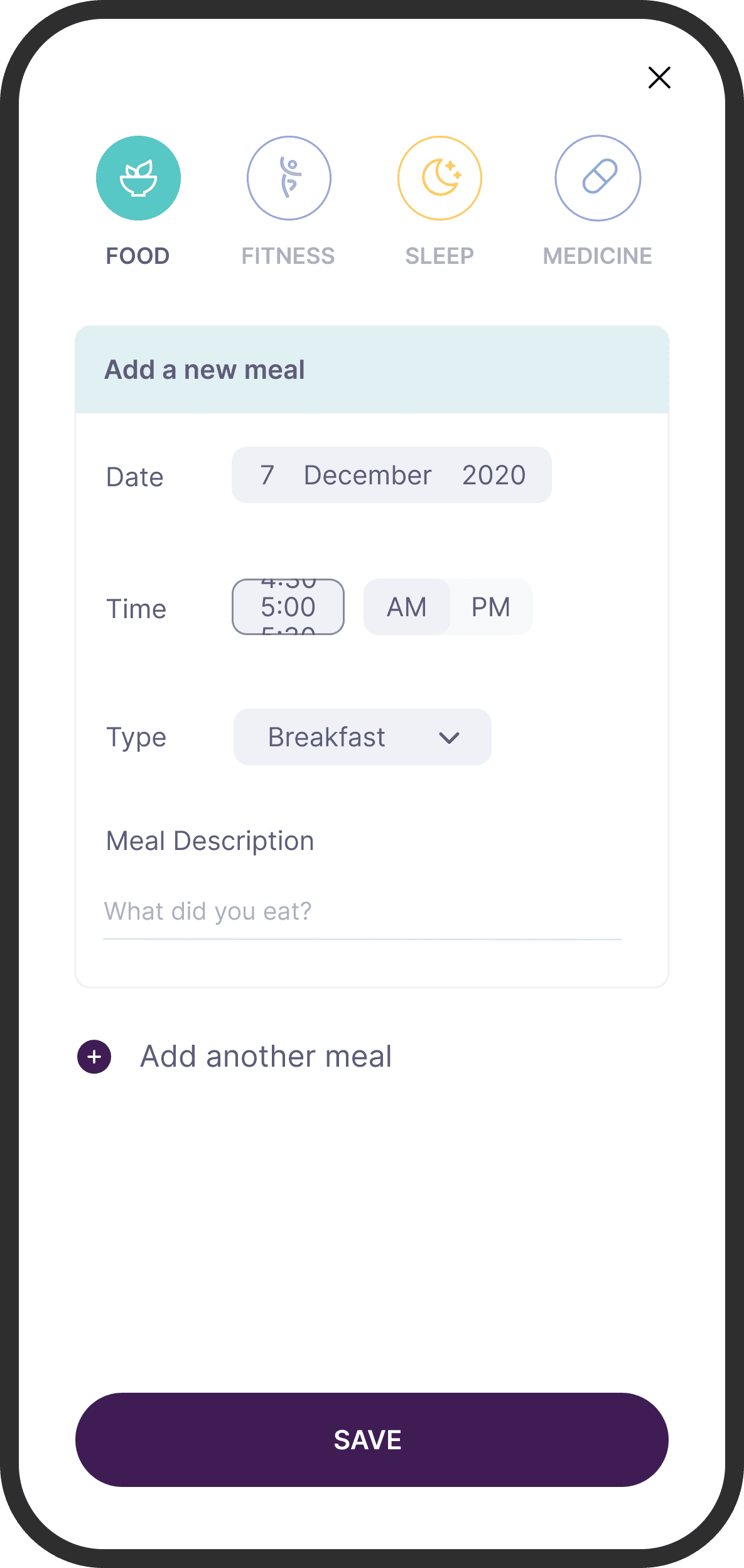 Apart from increasing the size of the buttons and making actions clearer, I used segmented buttons for the Date field. Looking at past user research, I found that a lot of users would either log the same day’s or the previous day’s meals. Using a segmented button rather than a dropdown date input control, would save a few redundant taps and make the experience feel faster.